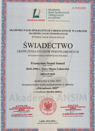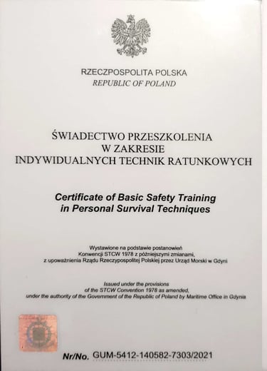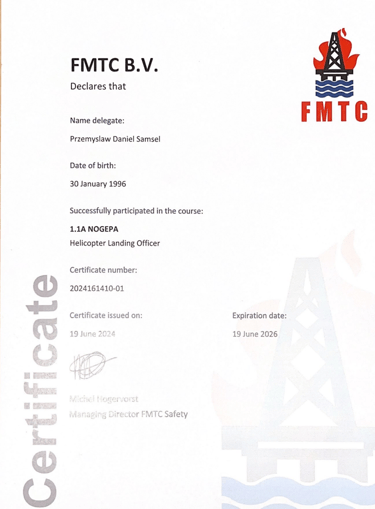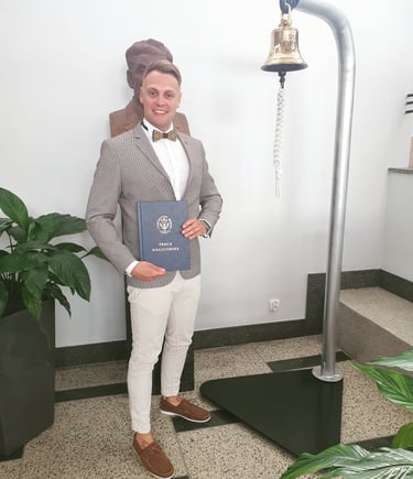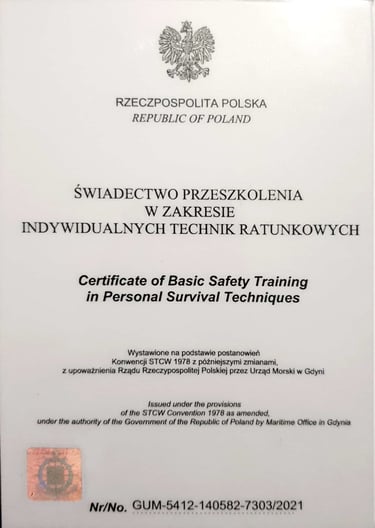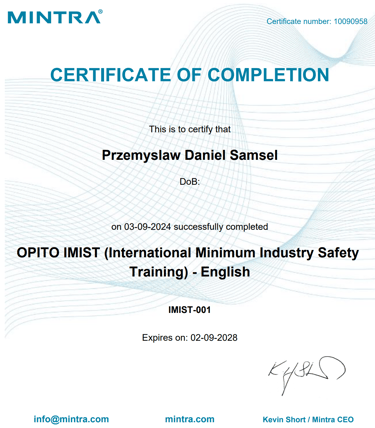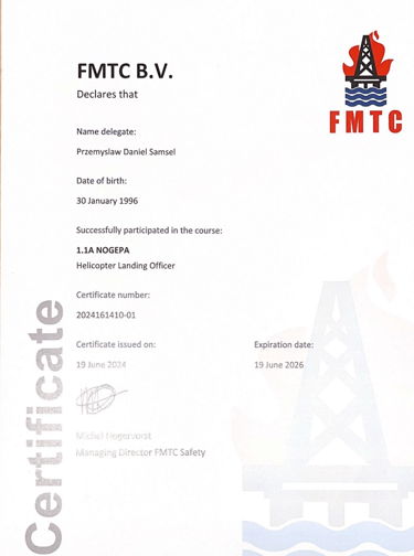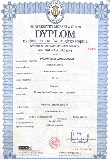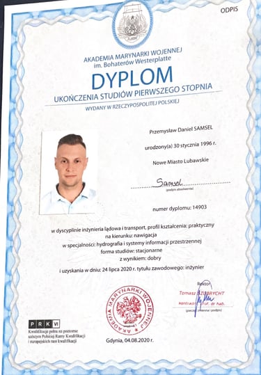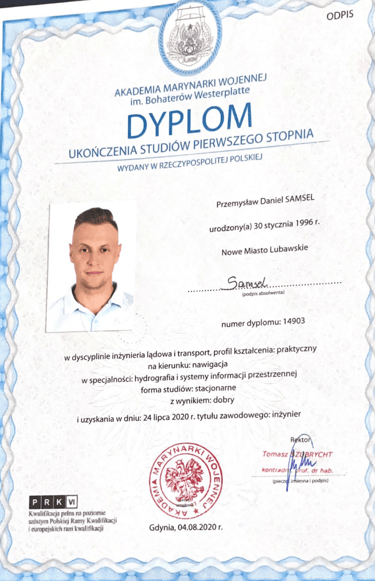 Absolwent Akademii Marynarki Wojennej na kierunku Nawigacja ze specjalnością hydrografia i systemy informacji przestrzennych. Magister inżynier Morskich Systemów Transportowych i Logistycznych. Po ukończeniu Zarządzania BHP, starszy inspektor BHP. Bogate doświadczenie w branży offshore na wszelakiego rodzaju projektach m. in. na farmach wiatrowych, platformach produkcyjnych, układaniu kabli podwodnych, pracach remontowych na stoczni.
